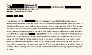 January 2014. The preliminary planning grant was reviewed. One reviewer was concerned about the alcohol industry, but NIAAA staff were able to exclude the reviewer from voting on procedural grounds. When responding to reviewer comments, Mukamal stated that he “tried to be discrete about the industry stuff.” The grant was formally awarded on March 20, 2014. There was a parallel conference grant that was also successfully steered to Mukamal at the same time.