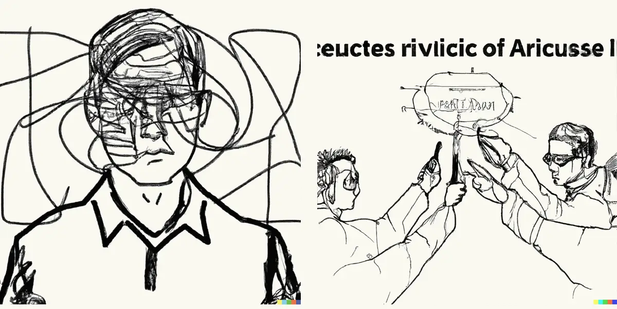 DALL·E prompts. Left: line drawing of AI predictions from the past. Right: sketch of researchers discussing AI 10 years ago.