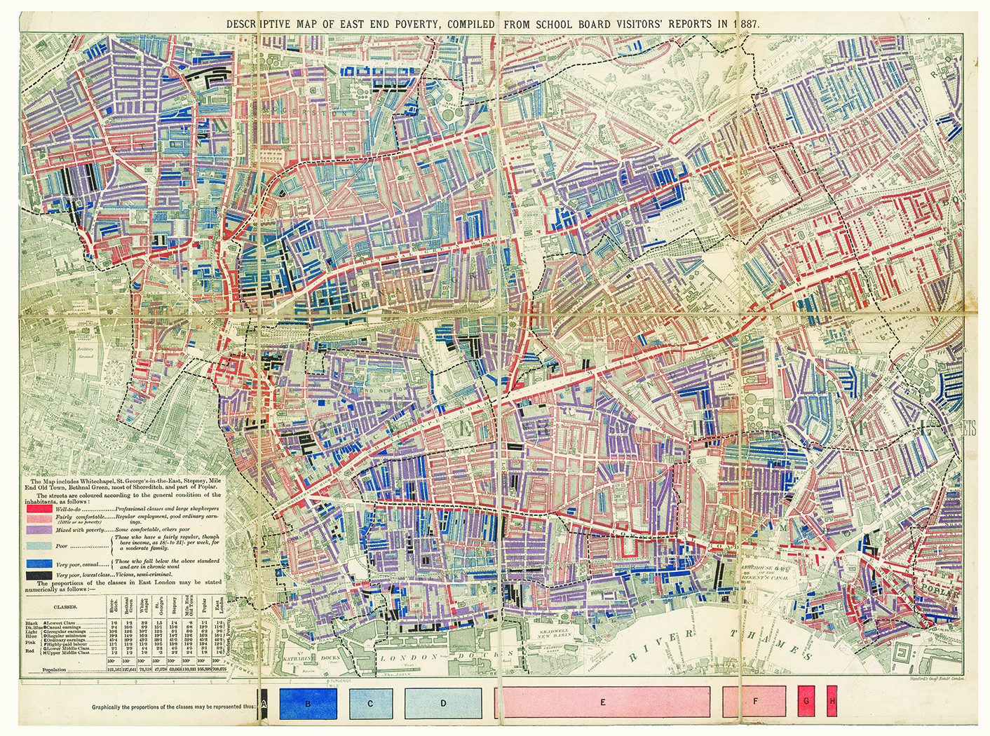 Descriptive map of London poverty in 1887, based on reports gathered from School Board visitors. From Charles Booth’s Inquiry into the Life and Labor of the People of London. Courtesy David Rumsey