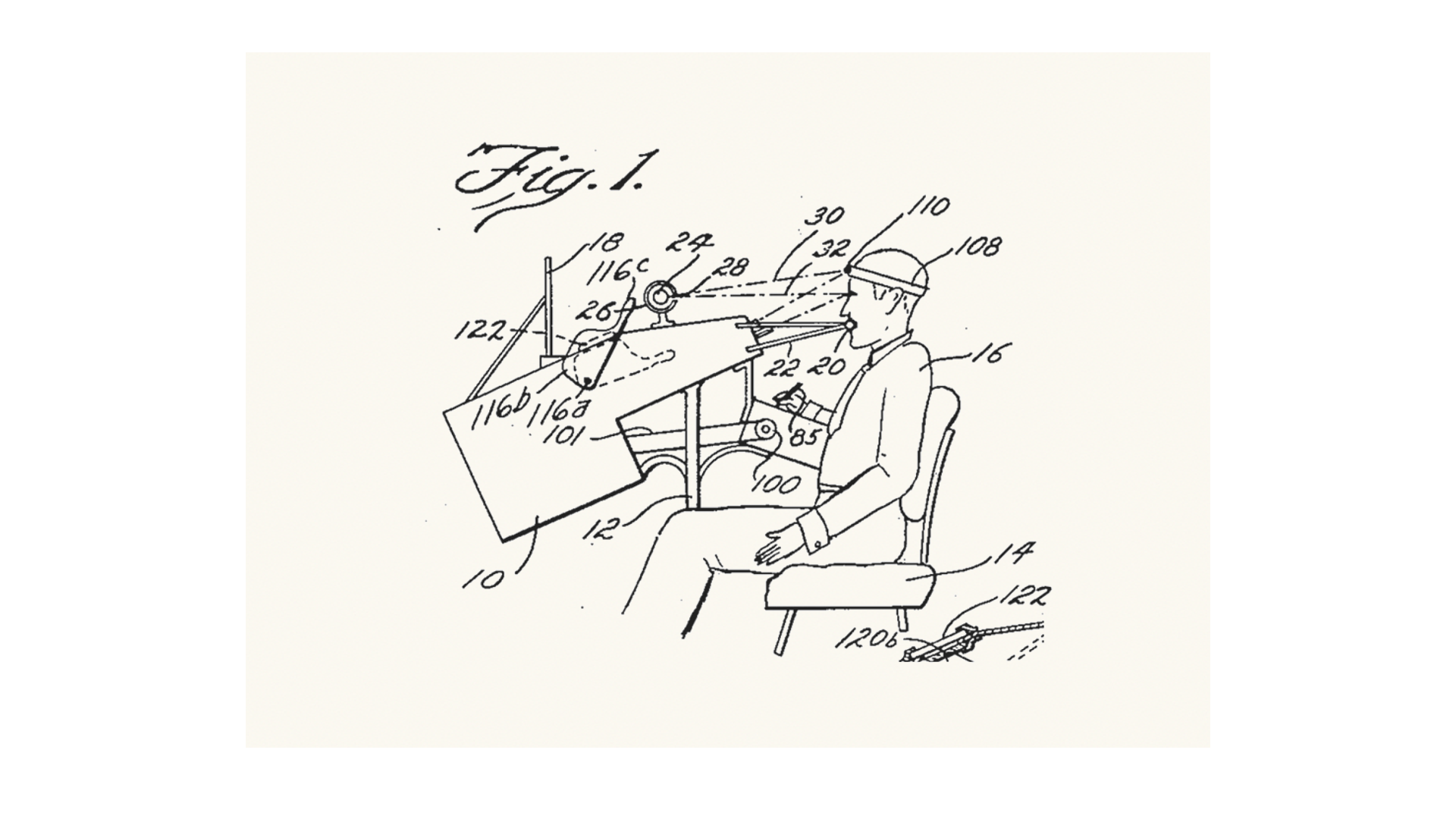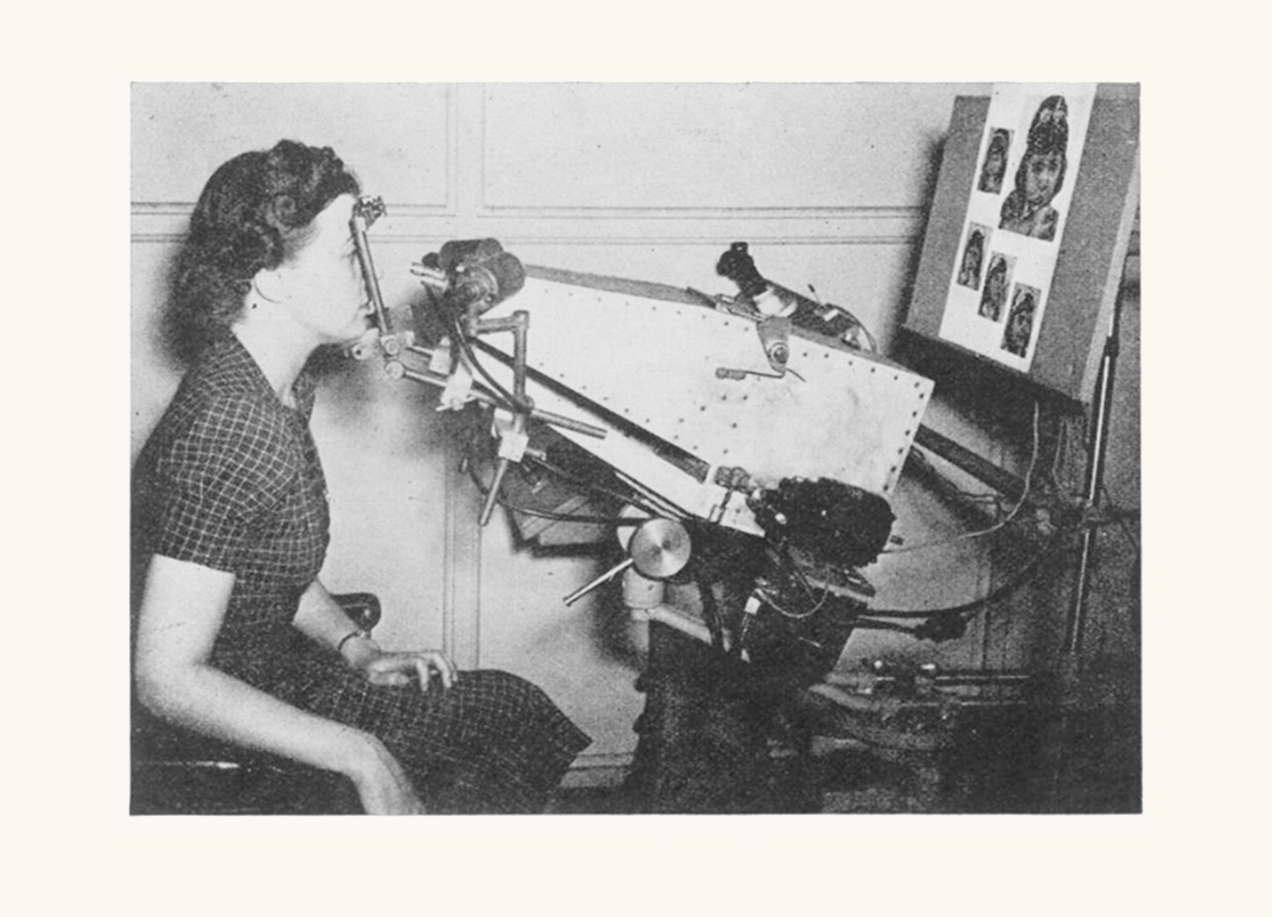 Brandt’s device made use of this established technique, but he was able to make a number of improvements on the exceedingly finicky and expensive systems of corneal reflection that had hitherto been reserved for highly specialized laboratory work. Systems like these depended on the head of the subject remaining perfectly stationary throughout the recording process. There was no way to distinguish between deflections of the corneal reflection caused by positional readjustment of the actual eyeball (moving your eyes), and those resulting from general motion of the head or body. Brandt incorporated into his system a clever technique for getting around this problem: a small reflecting bead was positioned on the forehead of the subject, and a secondary beam of oblique light recorded the physical displacement of this bead, which thus served as an index for the physical movements of the head itself. Inscribing those movements made it possible to correct the eye-tracking data for extraneous physical movements.
