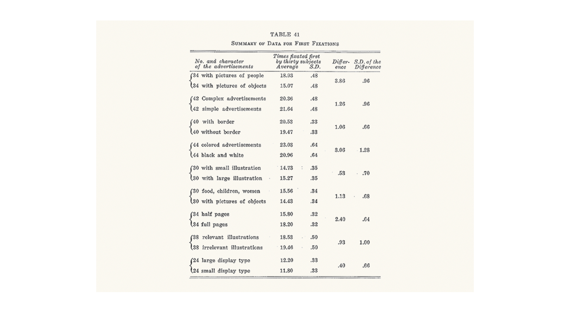 In Nixon’s earliest experiments, he would hide in an observation booth, accompanied by a metronome beating half seconds, and then watch closely as two ads were revealed to a seated subject. Ticking his pencil along the rungs of a fascinating little ladder-pad with each beat of the metronome (marking the left side when the eyes were to the left; marking the right side when the eyes were to the right), Nixon created a graphical record of the subject’s visual encounter with the two stimuli. Using this and other forms of what we might think of as “analog eye tracking,” Nixon and his collaborators tallied hundreds of hours of subjects’ perusals of stacks and stacks of advertisements, configured to test a host of hypotheses about what grabbed attention, for whom, and for how long. They tested ads with borders and without. They tested color ads against black and white. They tested ads with pictures of people against ads with pictures of objects. And they tested these differentia against some basic segmentation of the pool of subjects:
