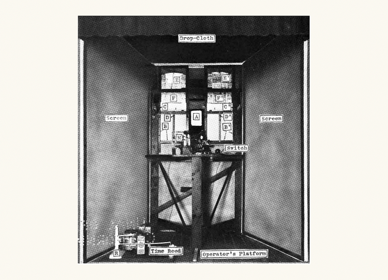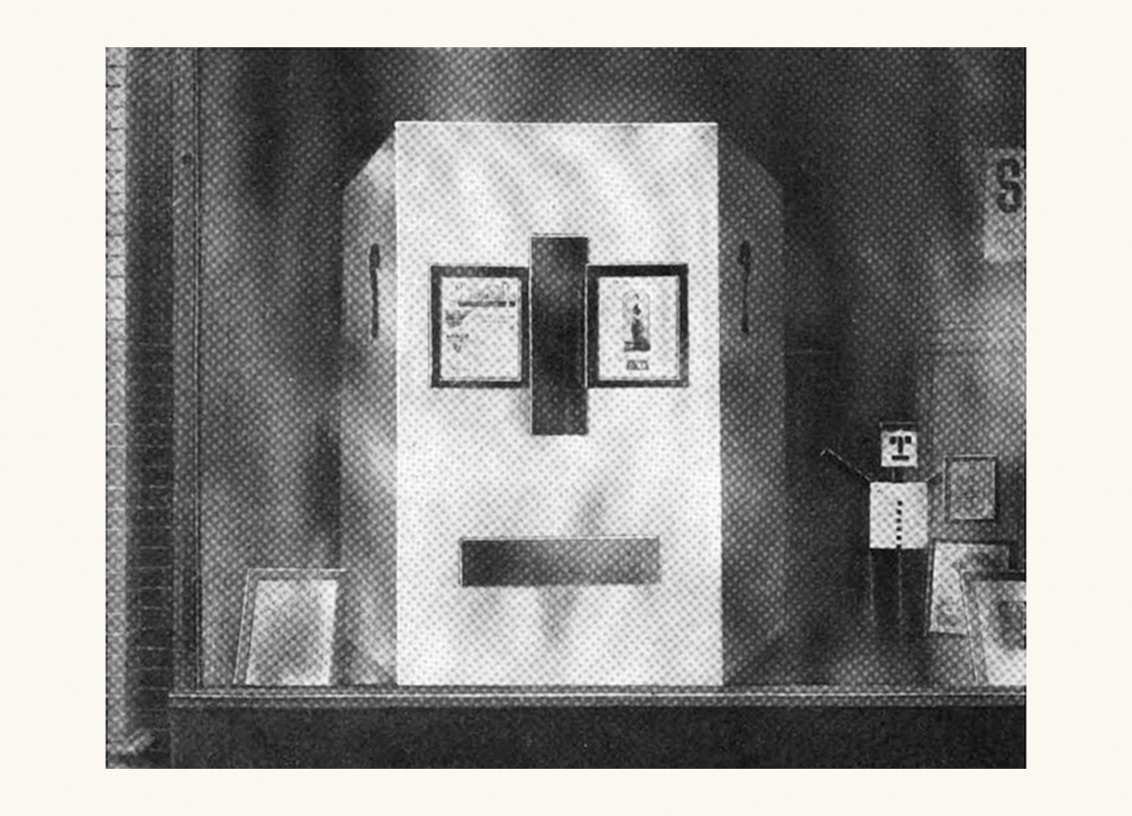 What we are looking at is the hidden booth where the experimenter sat watching the pedestrians. But not just watching. Also “baiting,” since Nixon had developed various techniques for luring pedestrians to take a closer look at his little “trap window” (bracket these for now; they were goofy). When someone approached the window, the operator threw a lever that dropped a pair of magazine ads into place as the “eyes” in the “face.” Then a recording protocol went into effect, with the observer keeping track, by means of switches in a modified teletype device, of which advertisement held the eyes, and for how long.