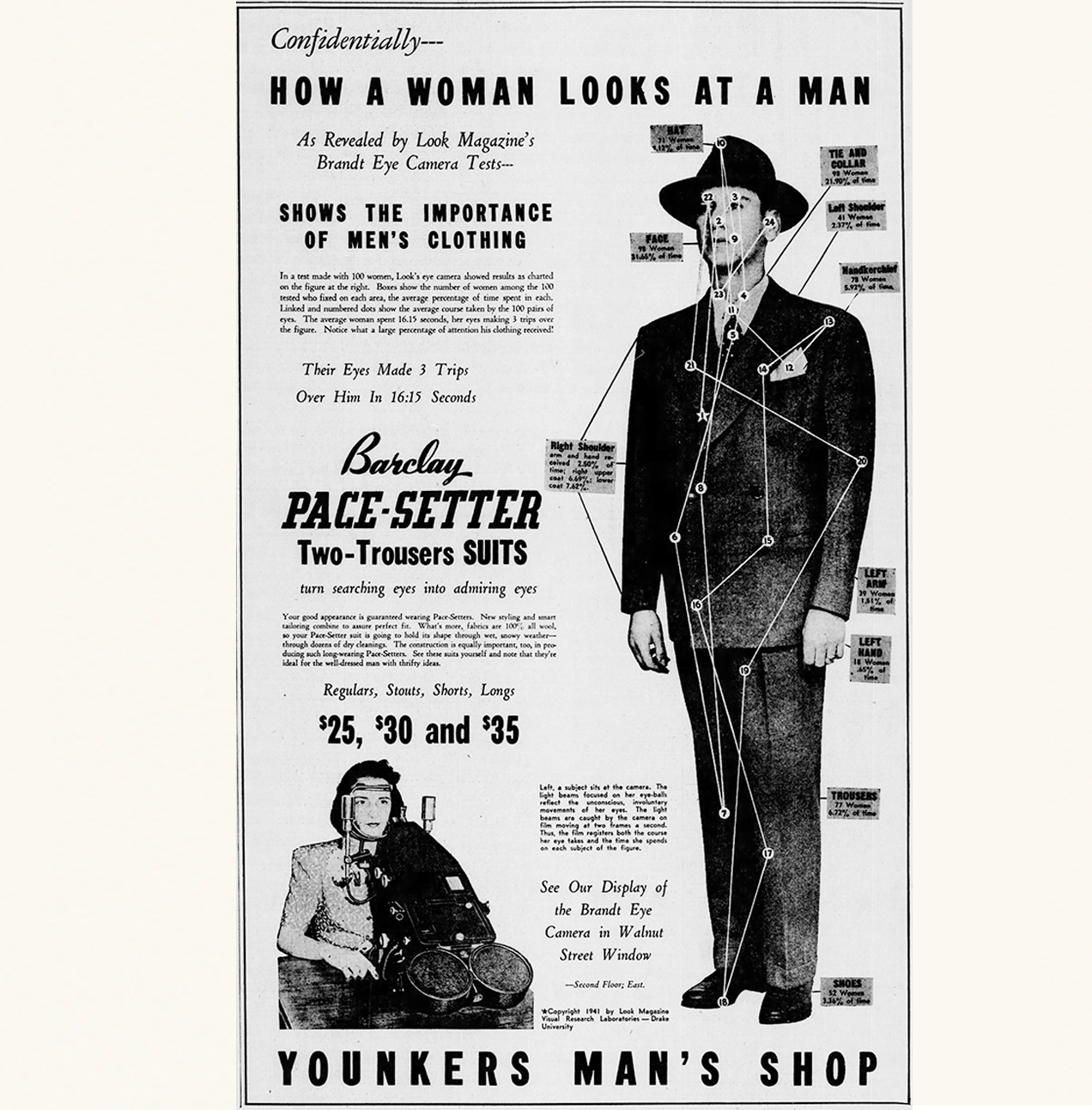 This amazing ad represents a perfect little punctum in the world of midcentury attentional surveillance, a moment in which the scientific advertisers advertised scientific advertising as…an advertisement. Which is to say, what we have here is an ad for menswear that deploys the datasets developed by an actual eye tracker that had been developed in order to measure the attention value of advertisements!