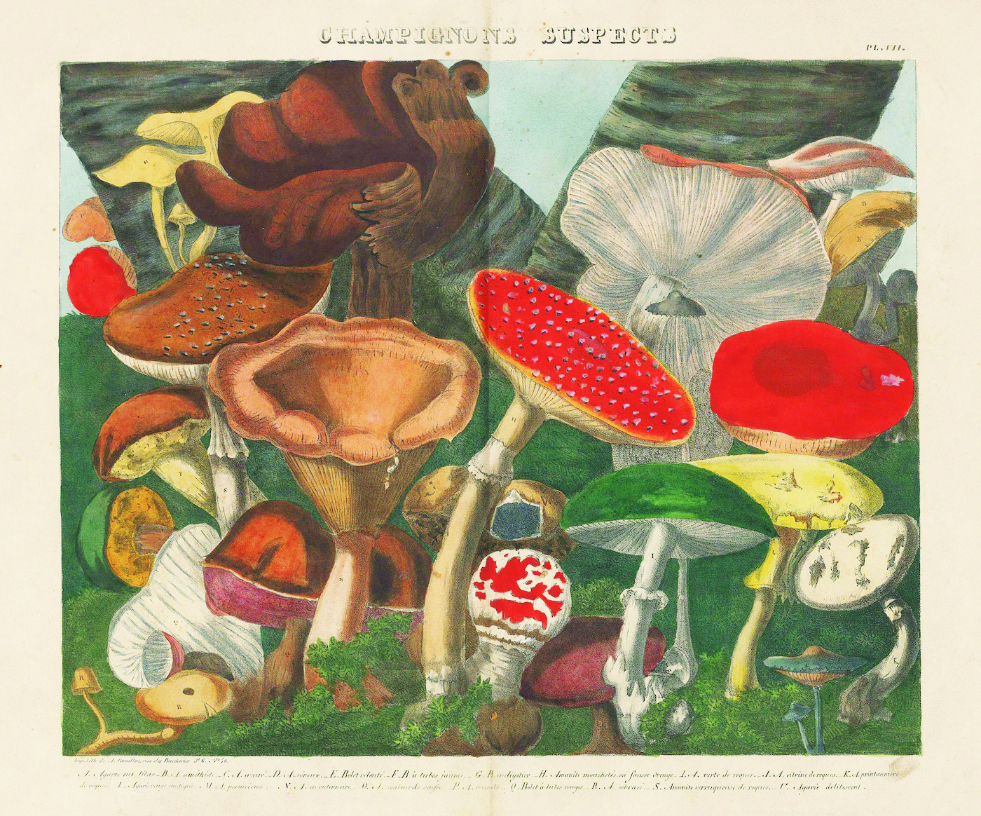 Hand-colored chromolithographs by A. Cornillon depict a range of mushrooms, some varieties familiar and others rare, including orange lion’s mane and chanterelles. These are published in Michel Étienne Descourtilz’s Atlas des champignons: comestibles, suspects et vénéneux.