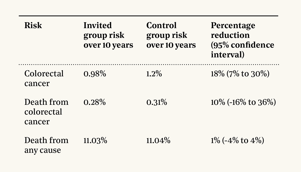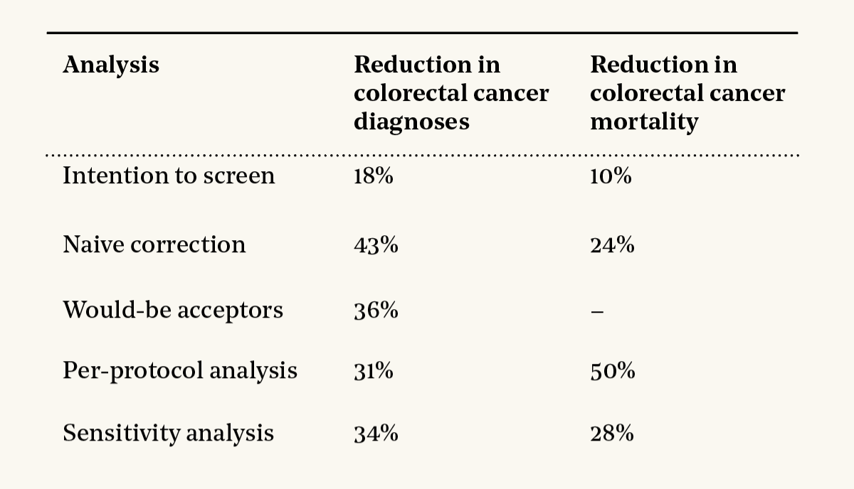 The main results in the paper are the intention-to-screen analysis that compares the controls to the whole invited group. This understates the benefits of colonoscopies because it ignores the fact that less than half of invited people agreed to have colonoscopies. But this analysis is ultrarobust, because it compares two perfectly randomized groups. It found an 18% reduction in colorectal cancer diagnoses and a 10% reduction in colorectal cancer mortality.