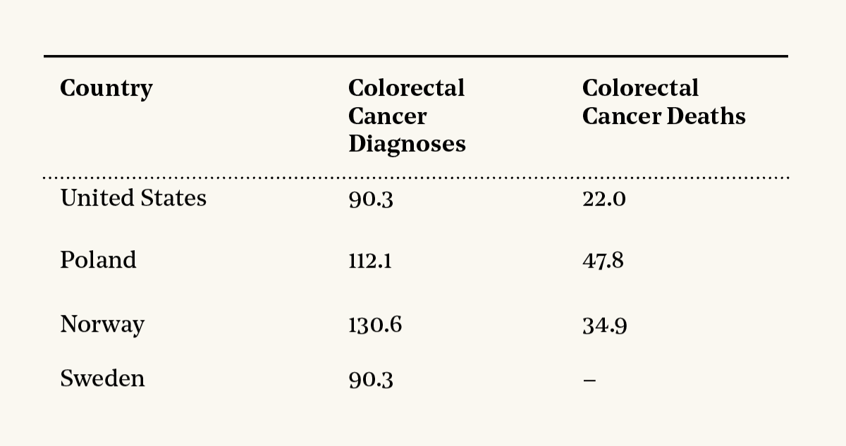 These are all age-standardized numbers for 2020. The mortality number for the U.S. comes from the CDC’s WONDER system, combining deaths from malignant neoplasm of the colon and rectum. All the other numbers come from the International Agency for Research on Cancer. (Mortality numbers aren’t available for Sweden.)