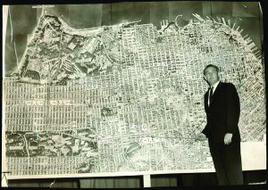 Caltrans district director Burch C. Bachtold standing before a map with the proposed new freeway system, April 6, 1964. Courtesy San Francisco History Center, San Francisco Public Library.