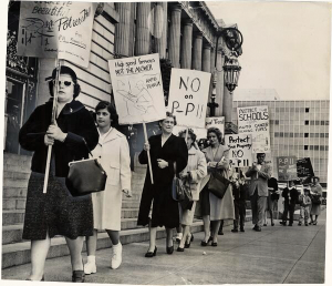 Picketers protesting against the Southern Freeway marching at City Hall April 18, 1961. Courtesy San Francisco History Center, San Francisco Public Library.