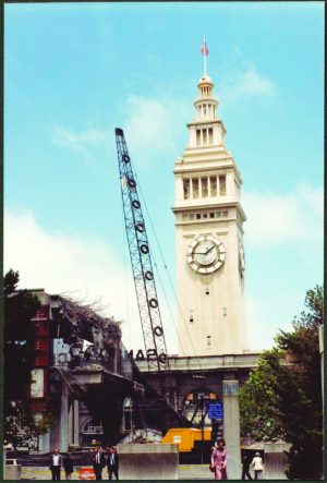 Embarcadero Freeway being demolished, 1991. The Embarcadero Freeway was severely damaged in the 1989 Loma Prieta Earthquake. In 1991, the decision was made to demolish the freeway rather than repair it. Courtesy San Francisco History Center, San Francisco Public Library.