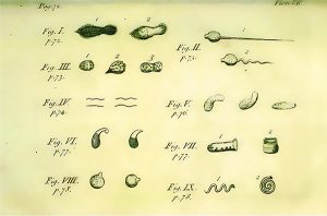 A copy of Antonie van Leeuwenhoek’s sketch of the first “animalcules” he identified with his microscope in a flask of pepper water (1676).