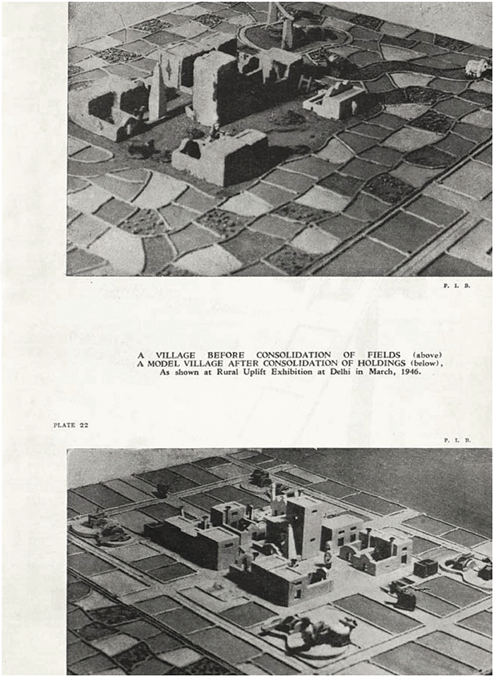“A village before consolidation of fields and a model village after consolidation,” Rural Uplift Exhibition, Delhi, March 1946.