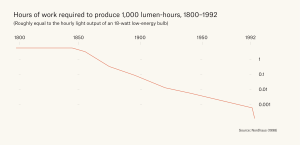 Take light, a technology which over the last few hundred years has seen enormous technological change. Helpfully, the “quality” of a light source is straightforward to quantify: we can compare the amount of illumination it generates over a fixed span of time (measured in lumen-hours) to its energy cost (which can be measured in British thermal units, or Btu).