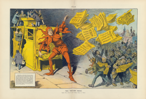 “The Yellow Press,” by L. M. Glackens, portrays William Randolph Hearst as a jester distributing sensational stories. Published October 12, 1910. Courtesy the Library of Congress.