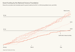 A May article in the New York Times documented the sharp cuts to the outflow of new grants by the NSF. For example, since 2015, the NSF has funded grants totaling $2 billion, on average, between Jan 1 and May 21. In 2025, that figure was $989 million, less than half. That is because on April 30, 2025, staff at NSF were told to “stop awarding all funding actions until further notice,” apparently for further review by political appointees.